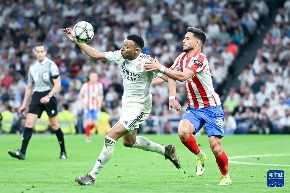 4月10日,皇家马德里队球员姆巴佩(左)和赫罗纳队球员莫雷诺争抢。