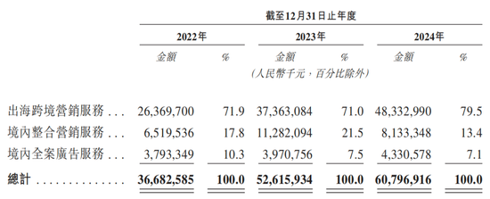 2022年-2024年(简称:报告期),蓝色光标营业收入分别为366.83亿元、526.16亿元、607.97亿元,复合年增长率达28.7%,其中七成以上来自出海跨境营销服务贡献。期内,公司出海跨境营销服务收入从263.70亿元增至483.33亿元,复合年增长率达35.4%,业务范围触达全球近200个国家和地区。