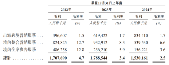 不过,让人无法忽视的是,其出海跨境营销服务利润较低,各期毛利率仅仅只有1.5%、1.7%、1.7%,受此影响,蓝色光标综合毛利率持续下滑,各期分别为4.7%、3.4%、2.5%。
